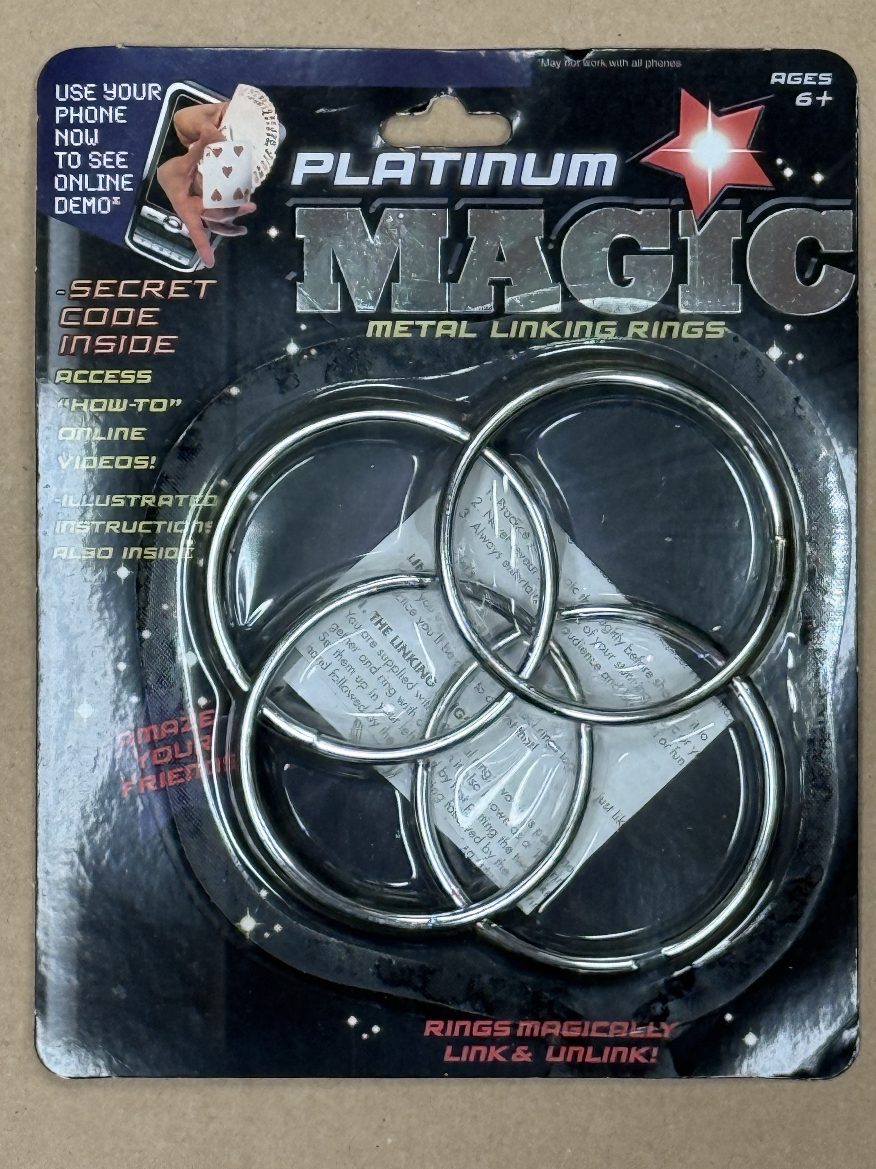 Turn a classic into a smooth, modern miracle with Platinum Magic 4 Linking Rings by Fantasma. This set includes four gleaming metal rings designed to link, unlink, and form chains right in your hands—solid steel seeming to melt through solid steel. They’re ideal for close-up or small platform shows, and sized so that younger magicians or smaller hands can handle them with confidence.